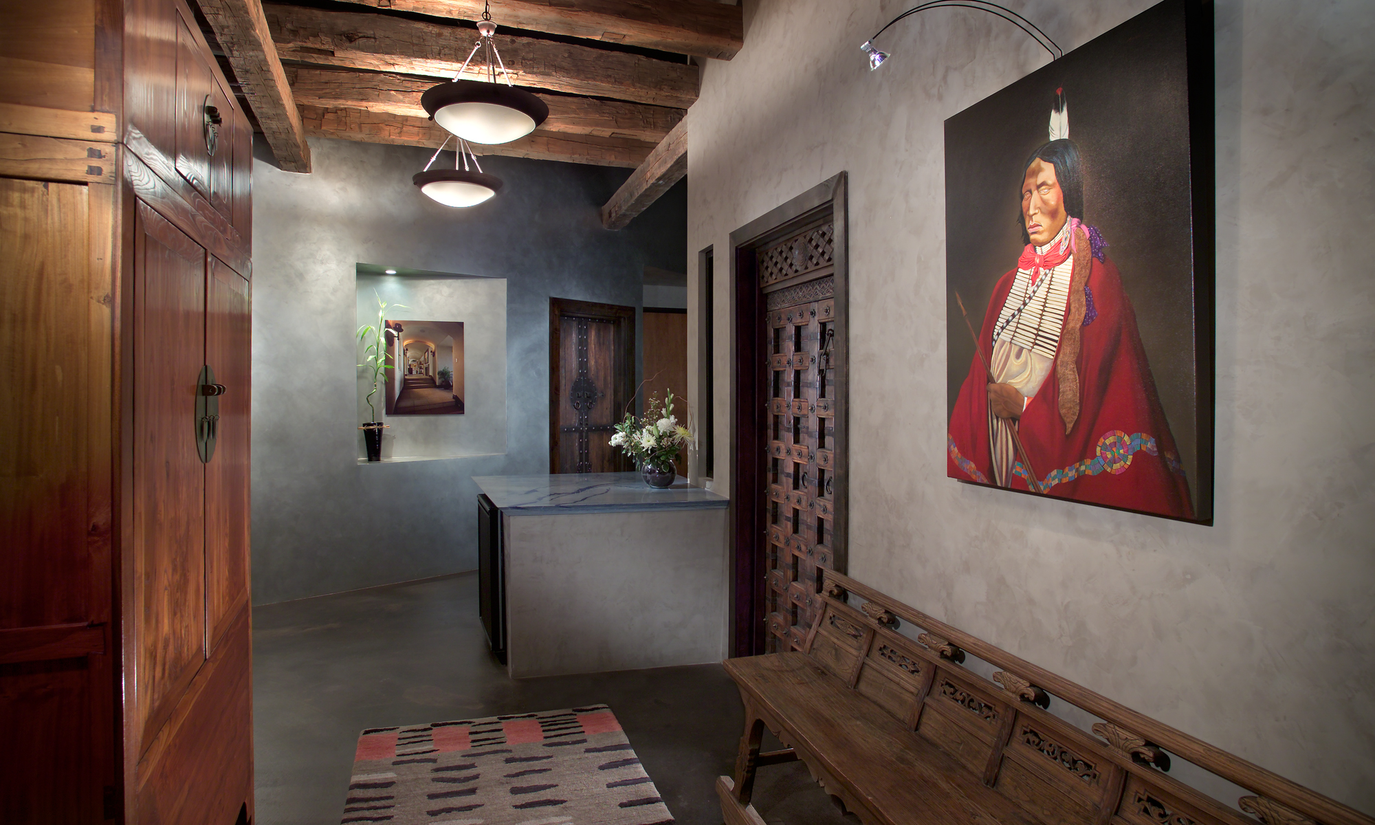 This contemporary office interior design with an Asian inspired feel, features local native artist paintings and artifacts from Asia. The architects’ office was designed to make a statement about the marriage of Asian influence (the architect’s) and Southwestern influence, which is the location of the business. This combination creates a stunning interior design by Janet Brooks and her team.