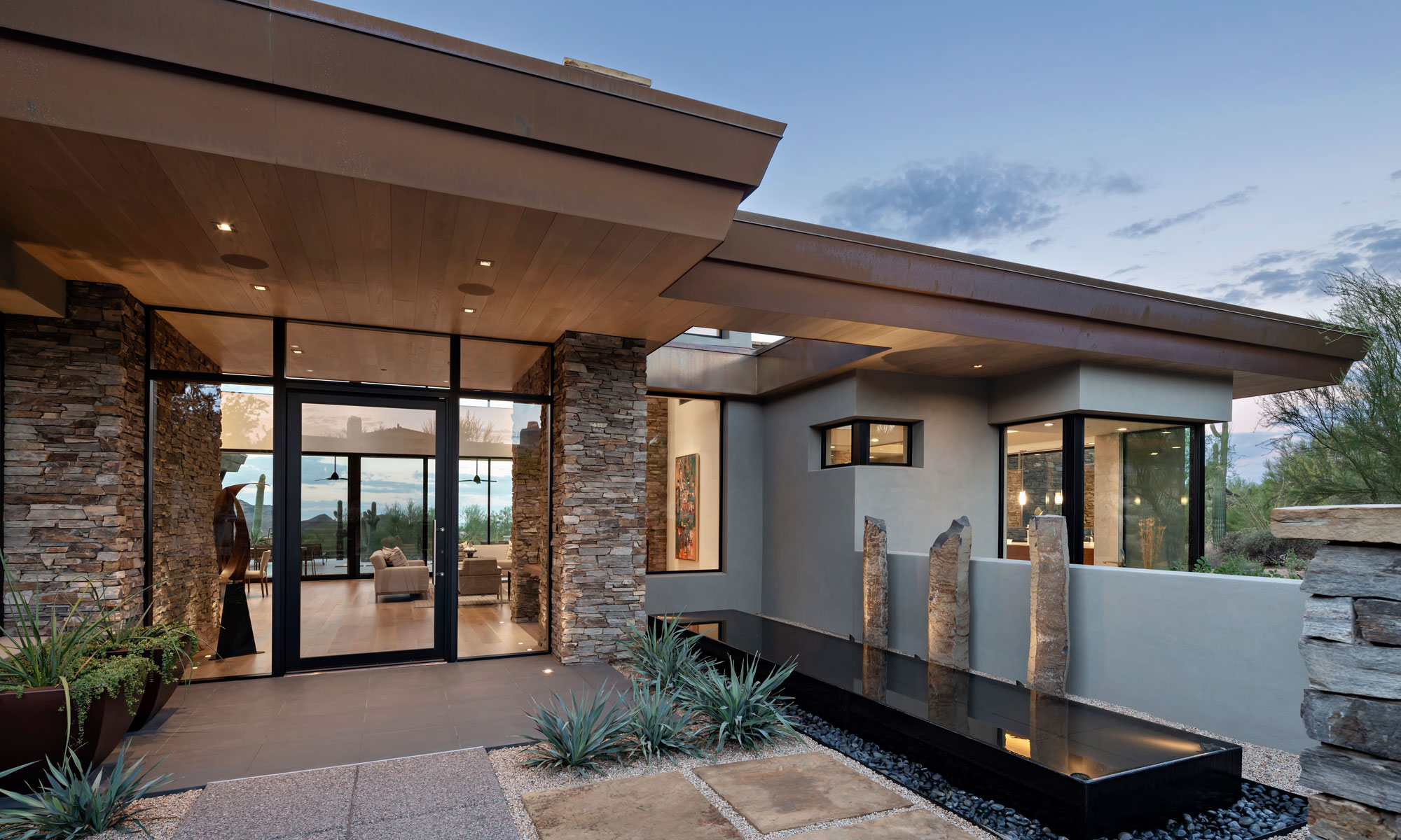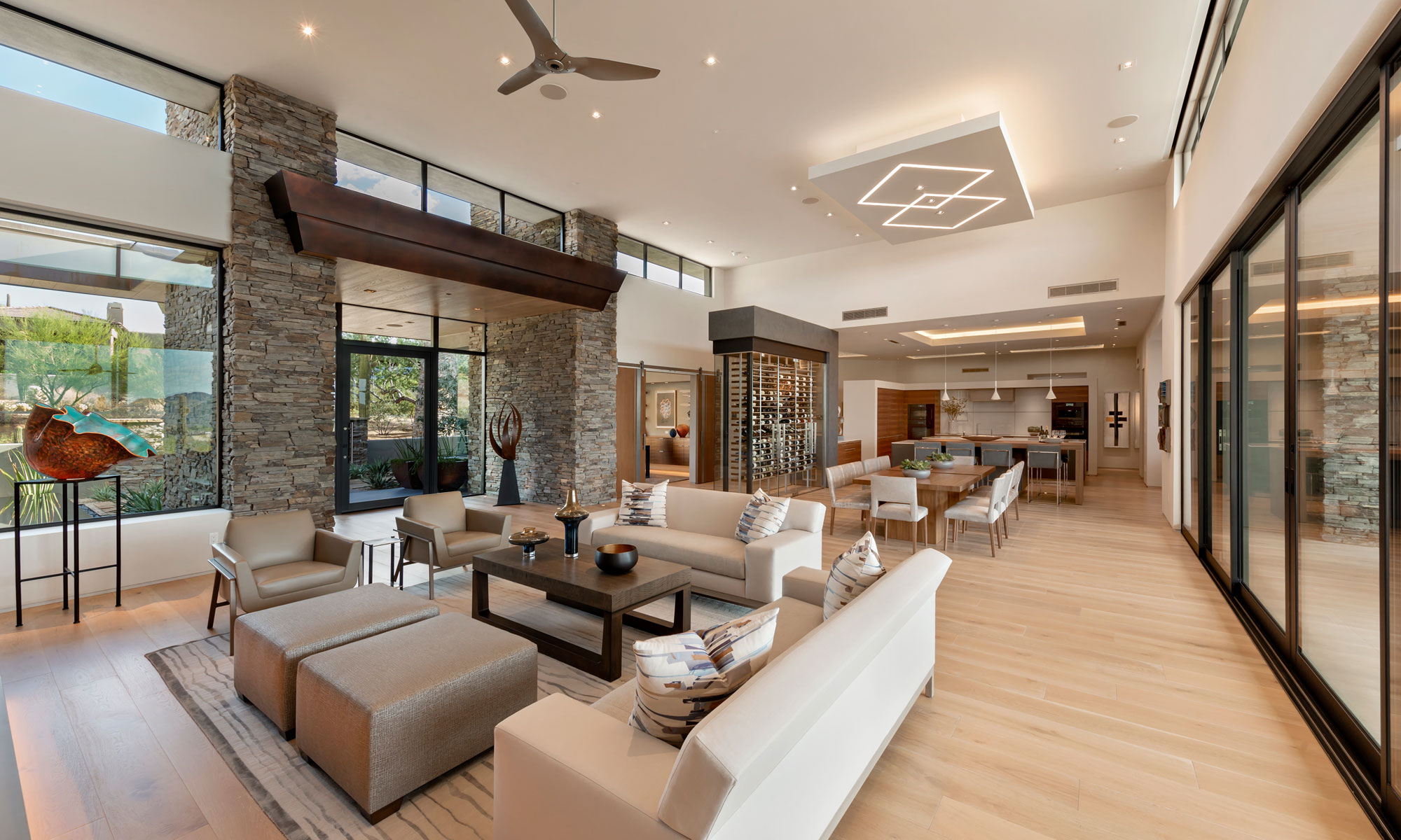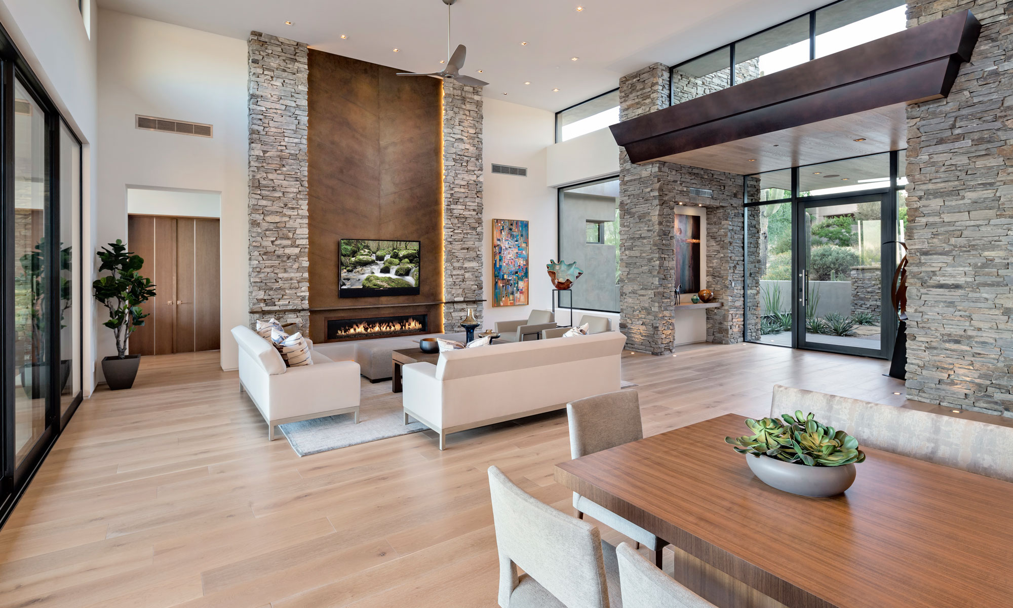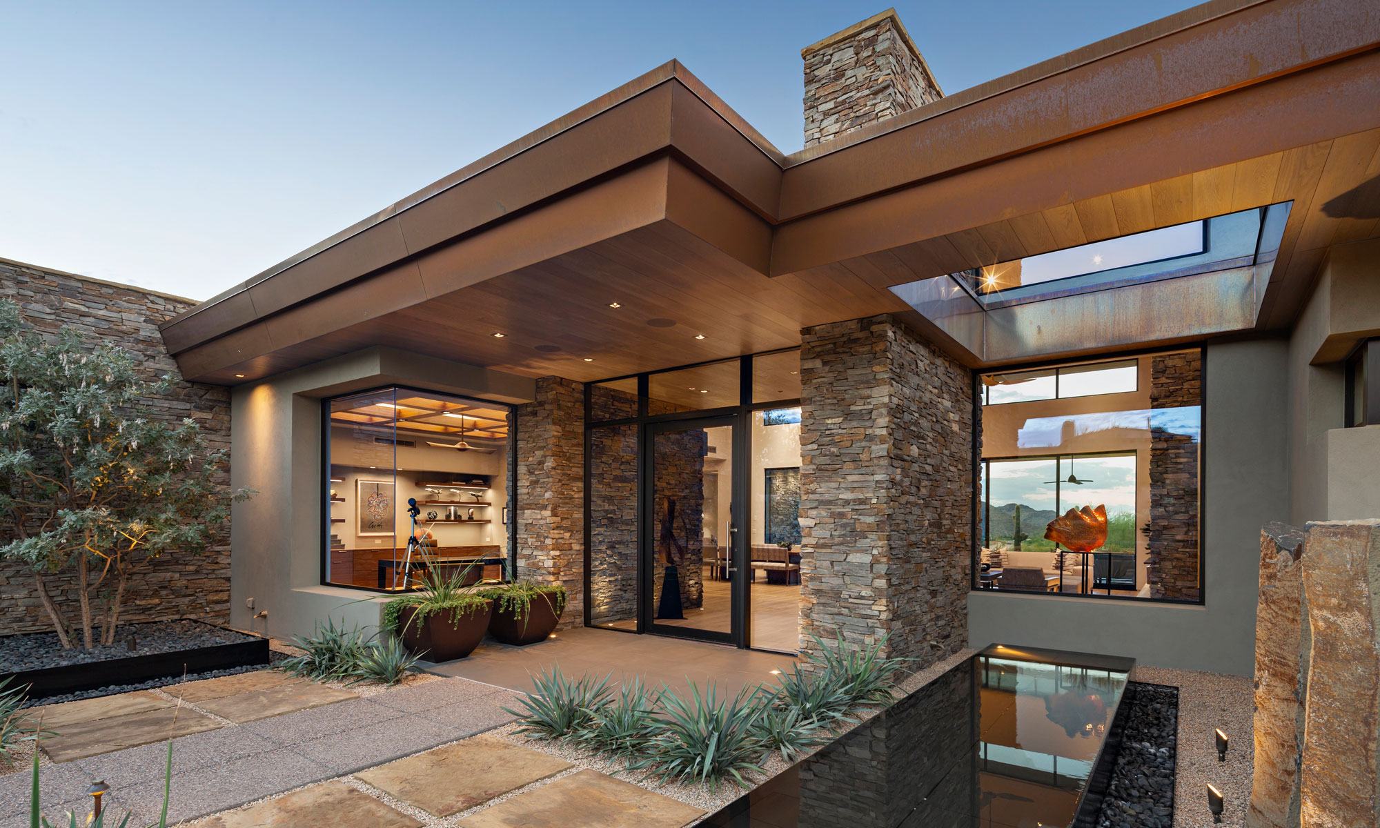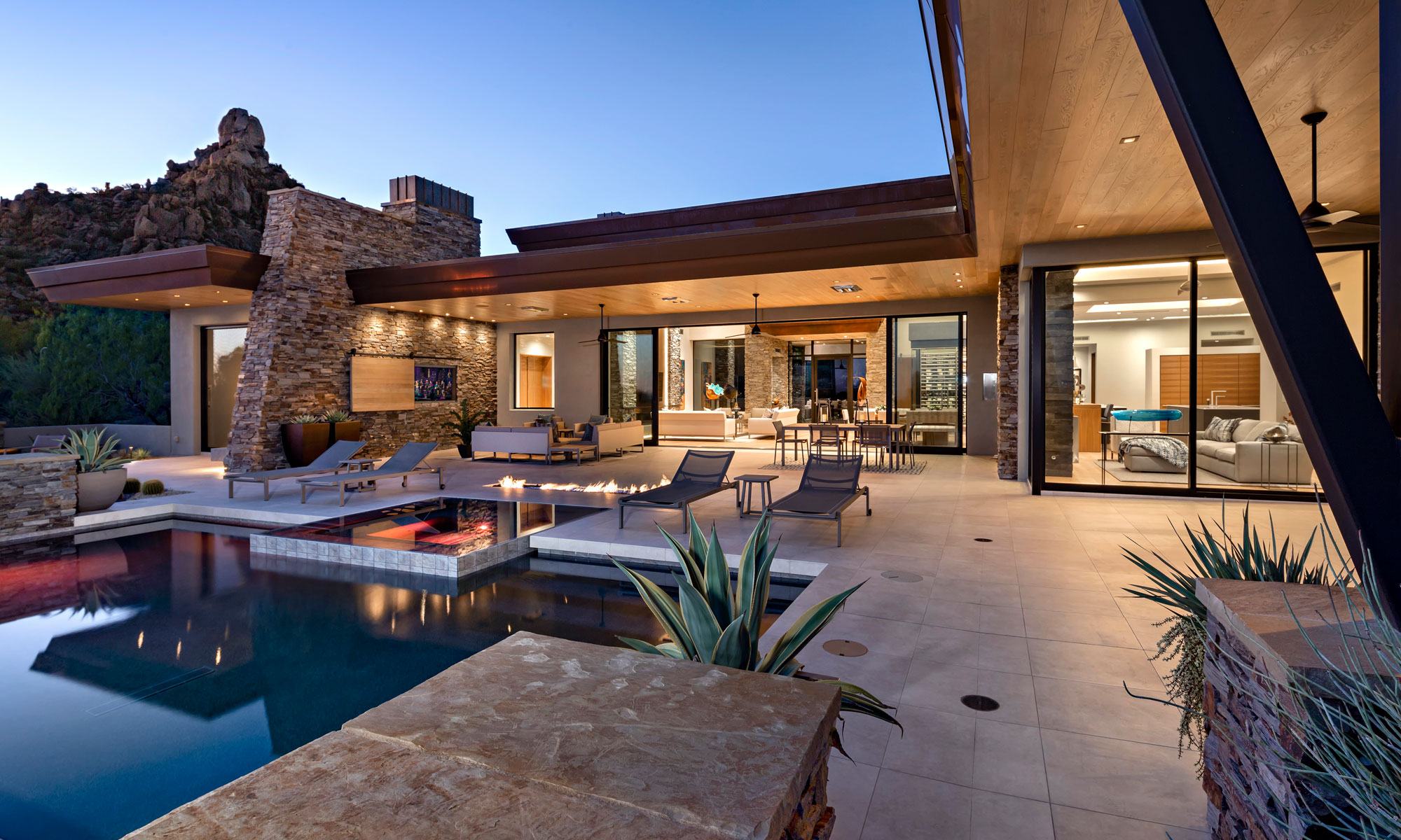 This custom home, located at the base of Pinnacle Peak in N. Scottsdale, AZ has incredible golf course and down valley views with a desirable southern orientation. The master bathroom features a full height window over the vanities to take advantage of the nearby views of Pinnacle Peak mountain, with ceiling mounted mirrors floating in front of the window. The great room takes advantage of our classic Arizona Indoor-Outdoor lifestyle, with a copper fireplace that marries the exterior copper fascia detail to the indoor space. Over the dining tables (which can be separated or pushed together as the occasion requires), a recessed diamond pattern in LED lighting defines the space yet keeps it open and unobstructed. A natural ledge stone used on exterior and interior walls visually ties to the color of the surrounding rock formations to the palette of the home.