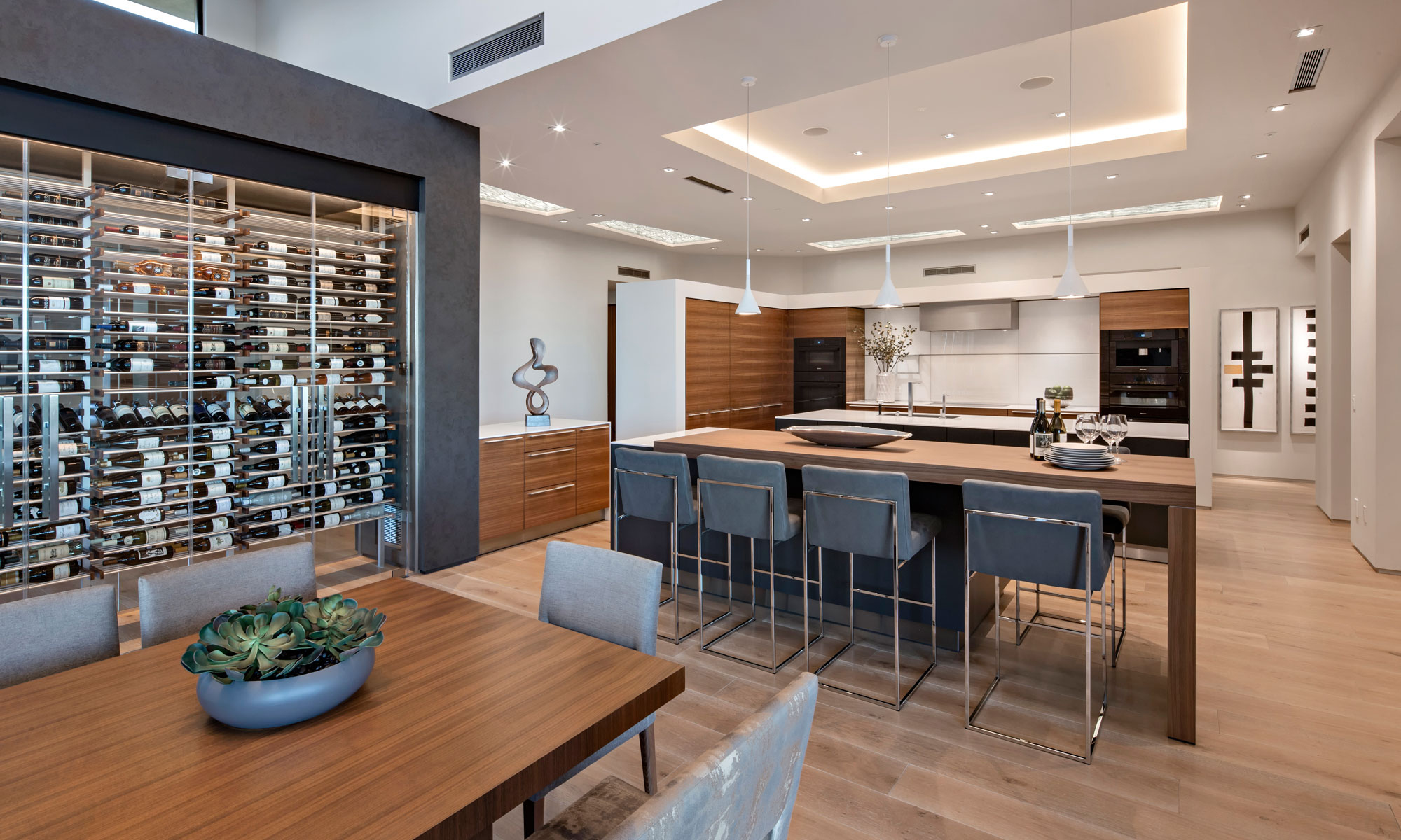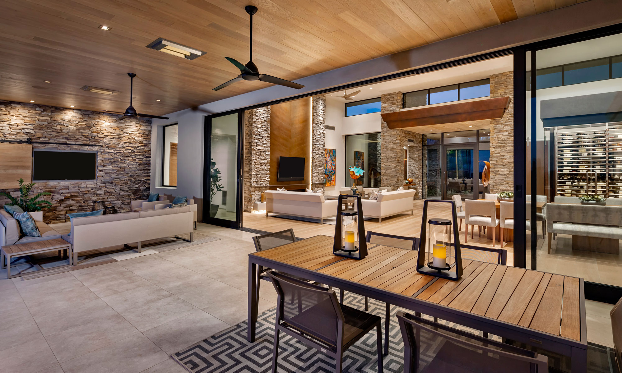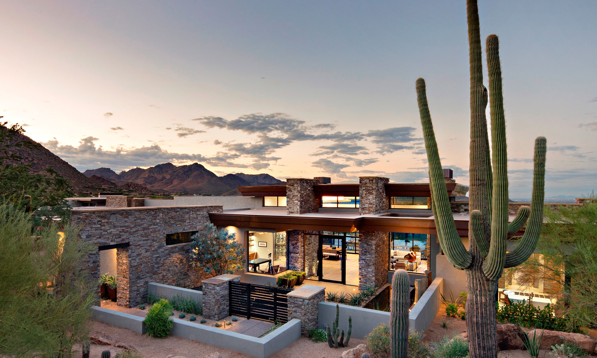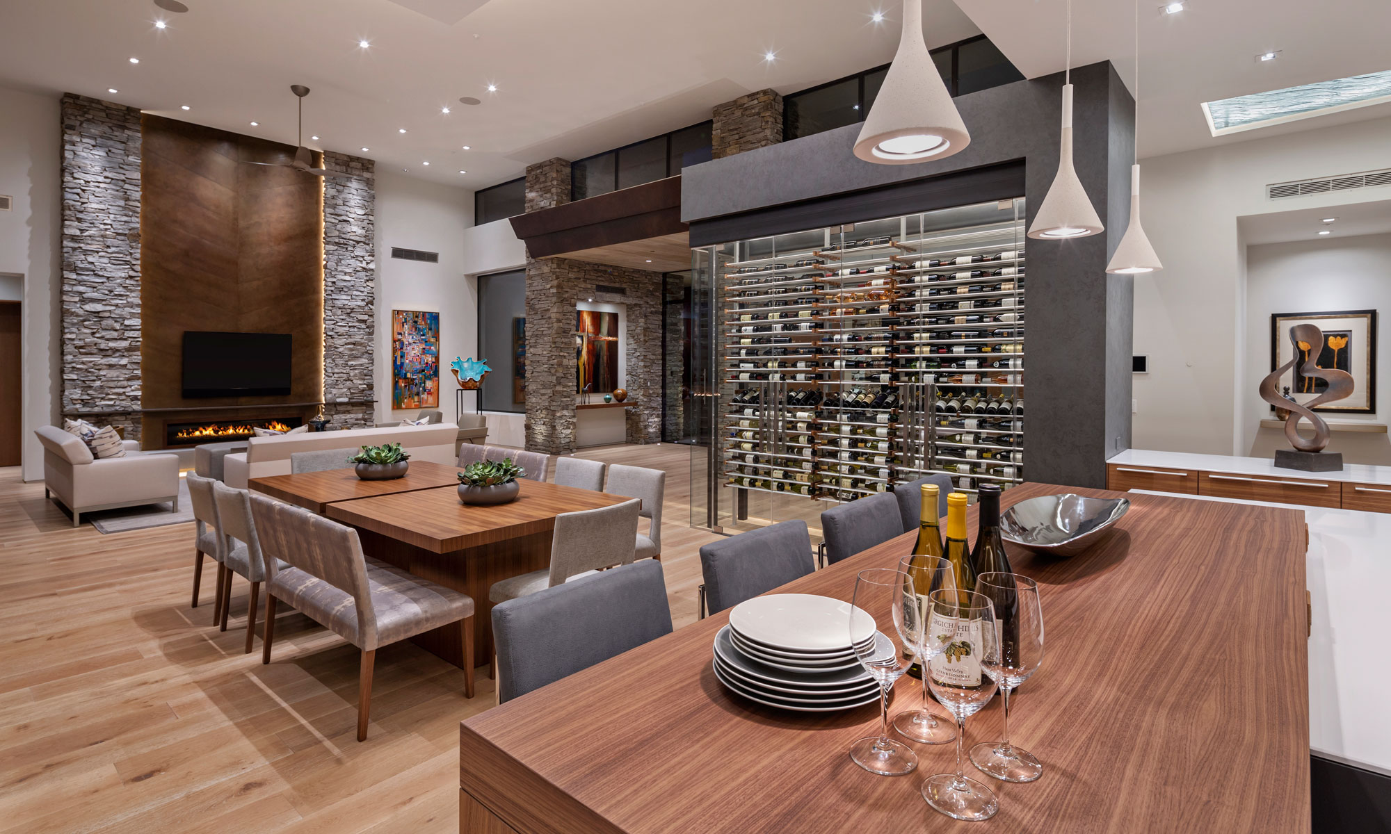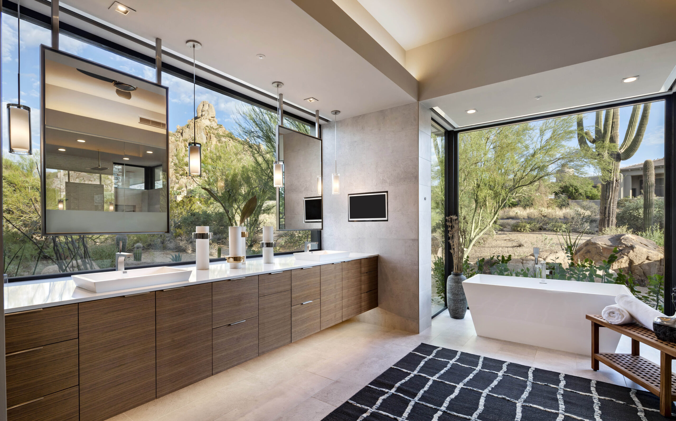 This custom home, located at the base of Pinnacle Peak in N. Scottsdale, AZ has incredible golf course and down valley views with a desirable southern orientation. The master bathroom features a full height window over the vanities to take advantage of the nearby views of Pinnacle Peak mountain, with ceiling mounted mirrors floating in front of the window. The great room takes advantage of our classic Arizona Indoor-Outdoor lifestyle, with a copper fireplace that marries the exterior copper fascia detail to the indoor space. Over the dining tables (which can be separated or pushed together as the occasion requires), a recessed diamond pattern in LED lighting defines the space yet keeps it open and unobstructed. A natural ledge stone used on exterior and interior walls visually ties to the color of the surrounding rock formations to the palette of the home.