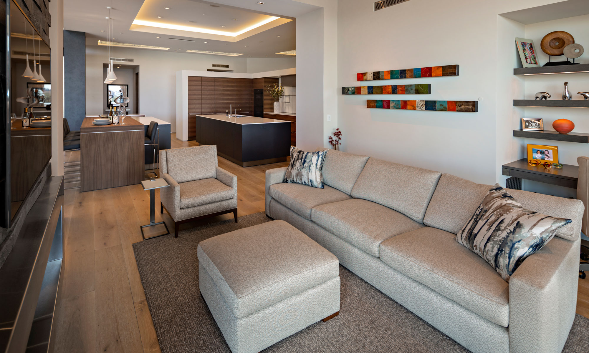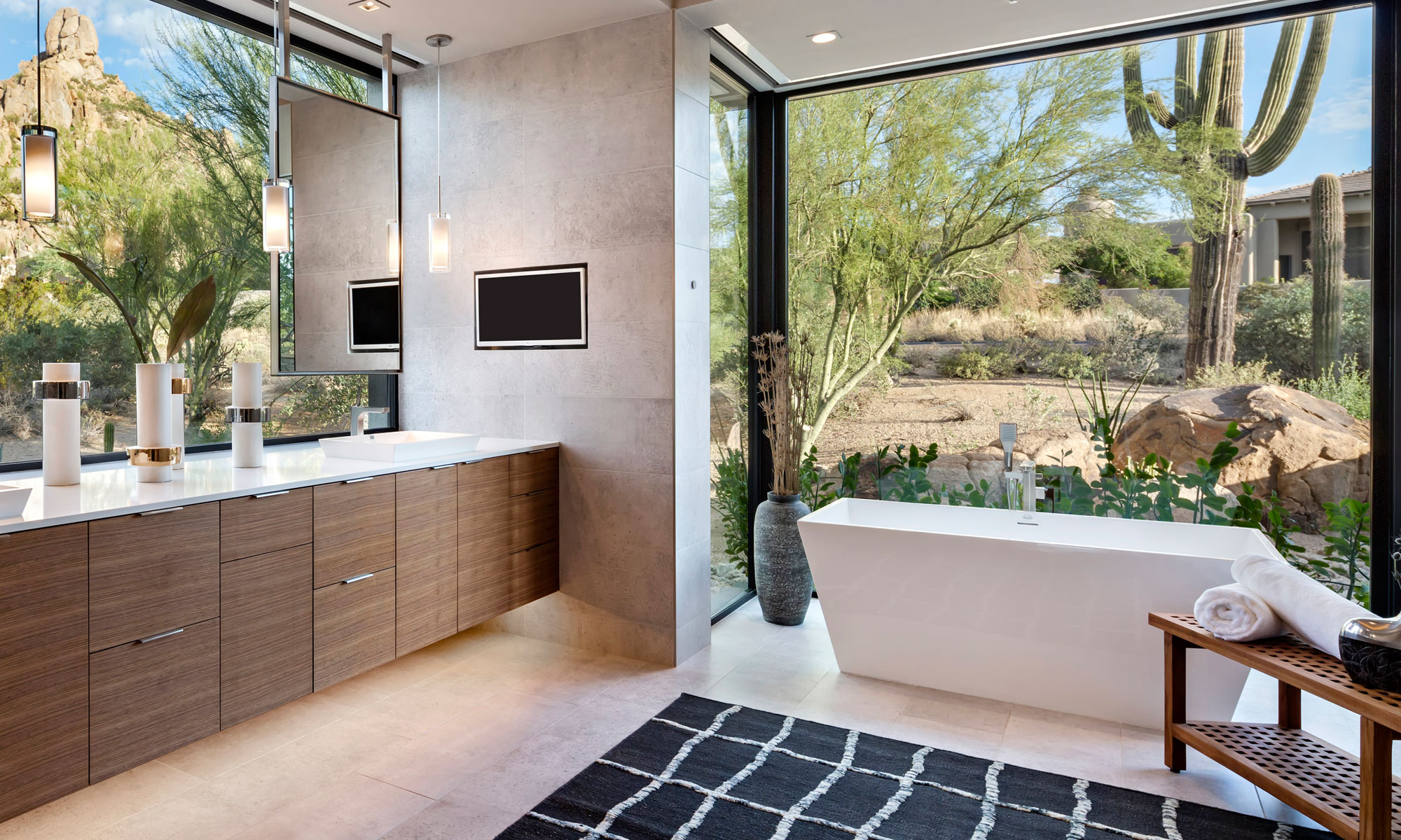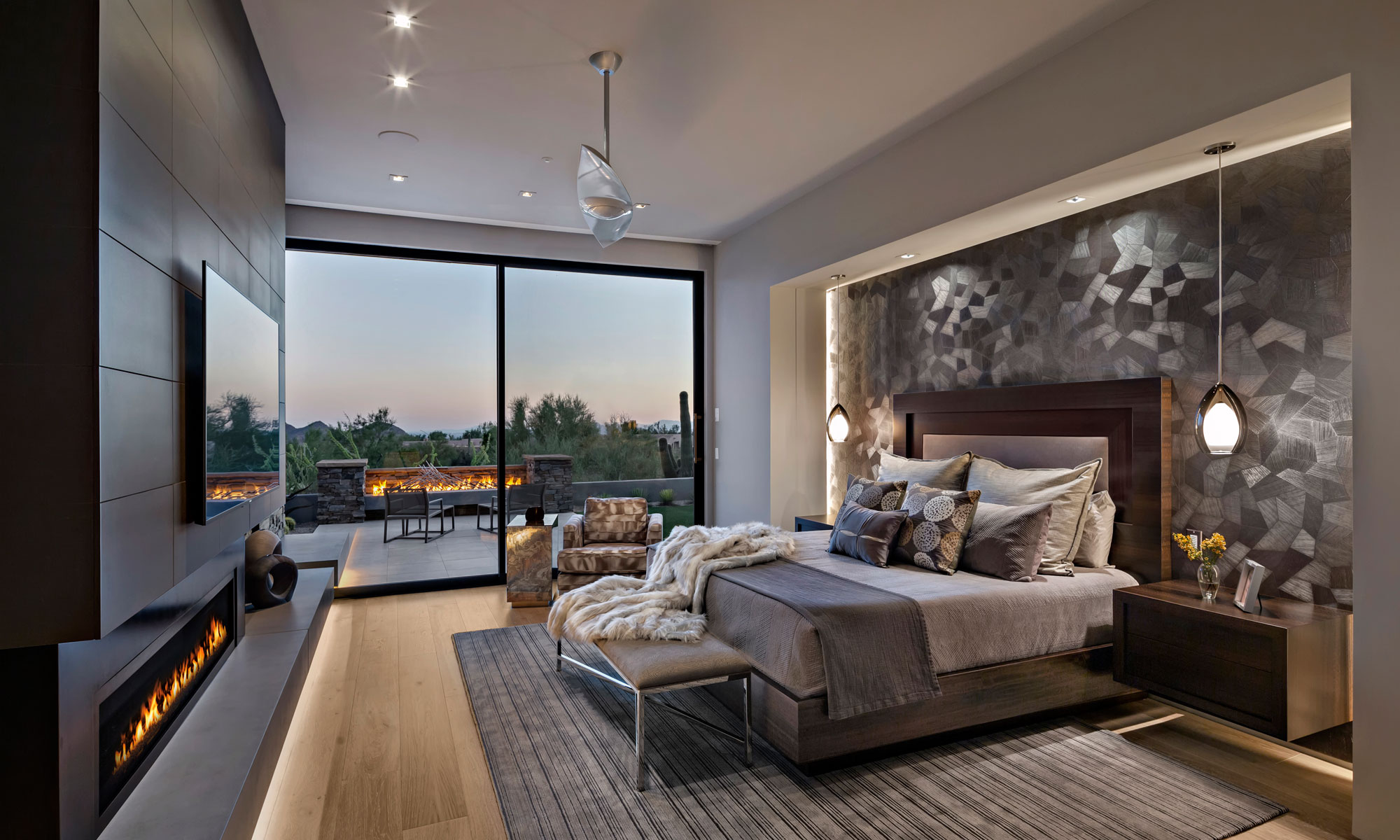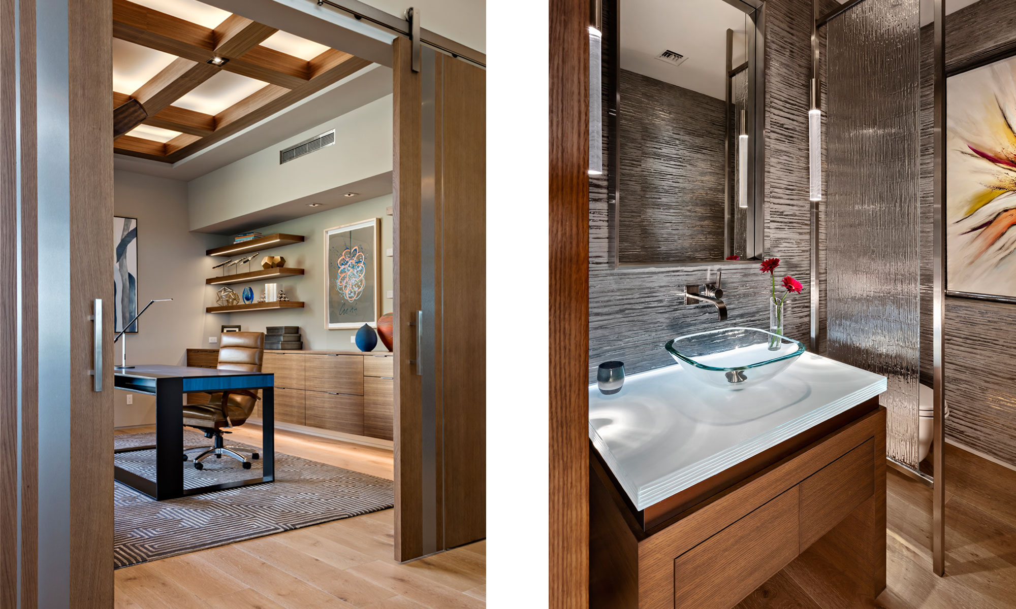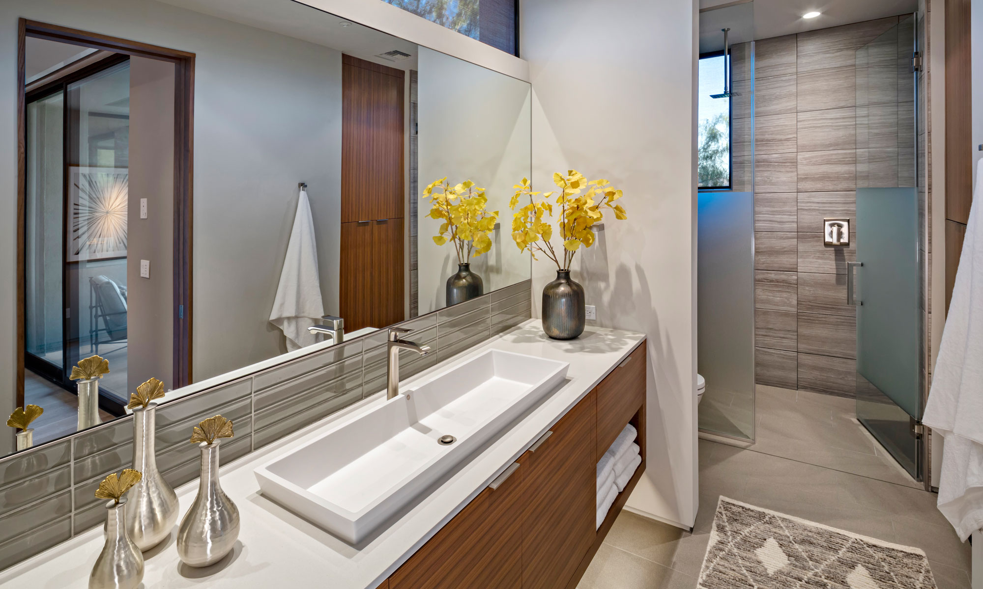 This custom home, located at the base of Pinnacle Peak in N. Scottsdale, AZ has incredible golf course and down valley views with a desirable southern orientation. The master bathroom features a full height window over the vanities to take advantage of the nearby views of Pinnacle Peak mountain, with ceiling mounted mirrors floating in front of the window. The great room takes advantage of our classic Arizona Indoor-Outdoor lifestyle, with a copper fireplace that marries the exterior copper fascia detail to the indoor space. Over the dining tables (which can be separated or pushed together as the occasion requires), a recessed diamond pattern in LED lighting defines the space yet keeps it open and unobstructed. A natural ledge stone used on exterior and interior walls visually ties to the color of the surrounding rock formations to the palette of the home.