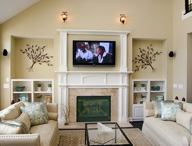 MISTAKE! In this room, guests would have to tilt their heads up while watching tv due to the awkwardly high placement of the television on the wall above the fireplace.