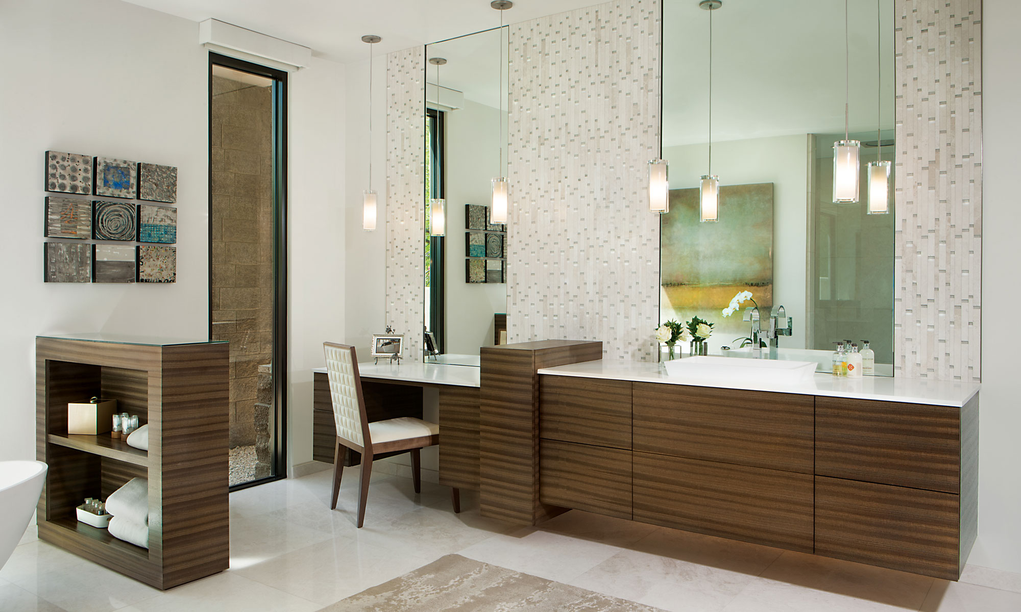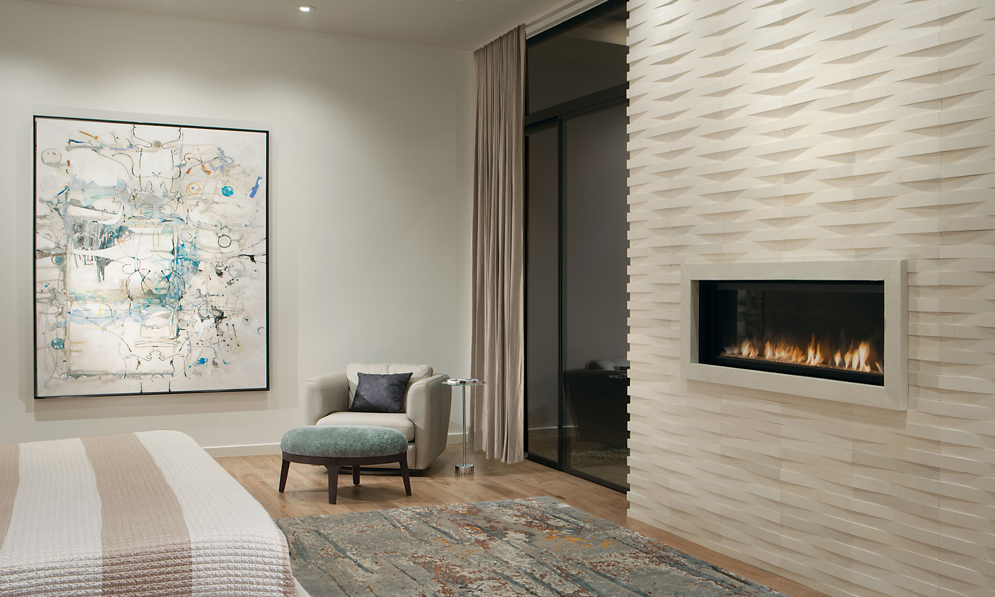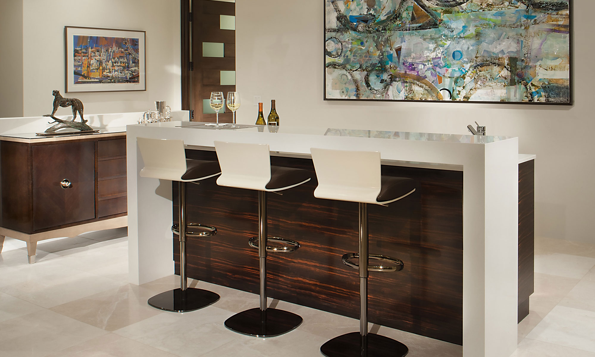 White marble flooring replaced old travertine. Soffits and architectural details were simplified incorporating indirect LED lighting, and old Alder cabinets were replaced with Walnut and Macassar Ebony floating cabinets. The new focal point of the great room is a stunning, massive Calacatta marble fireplace with floating concrete hearth.