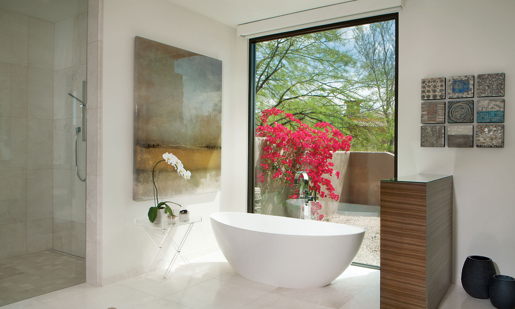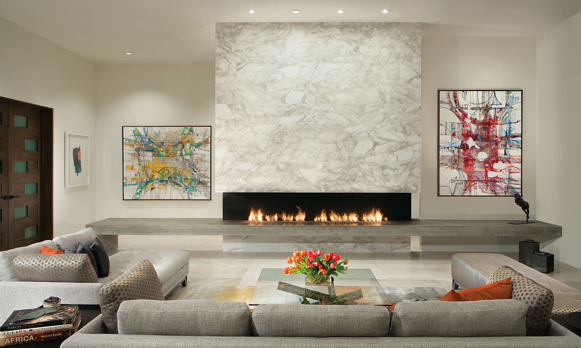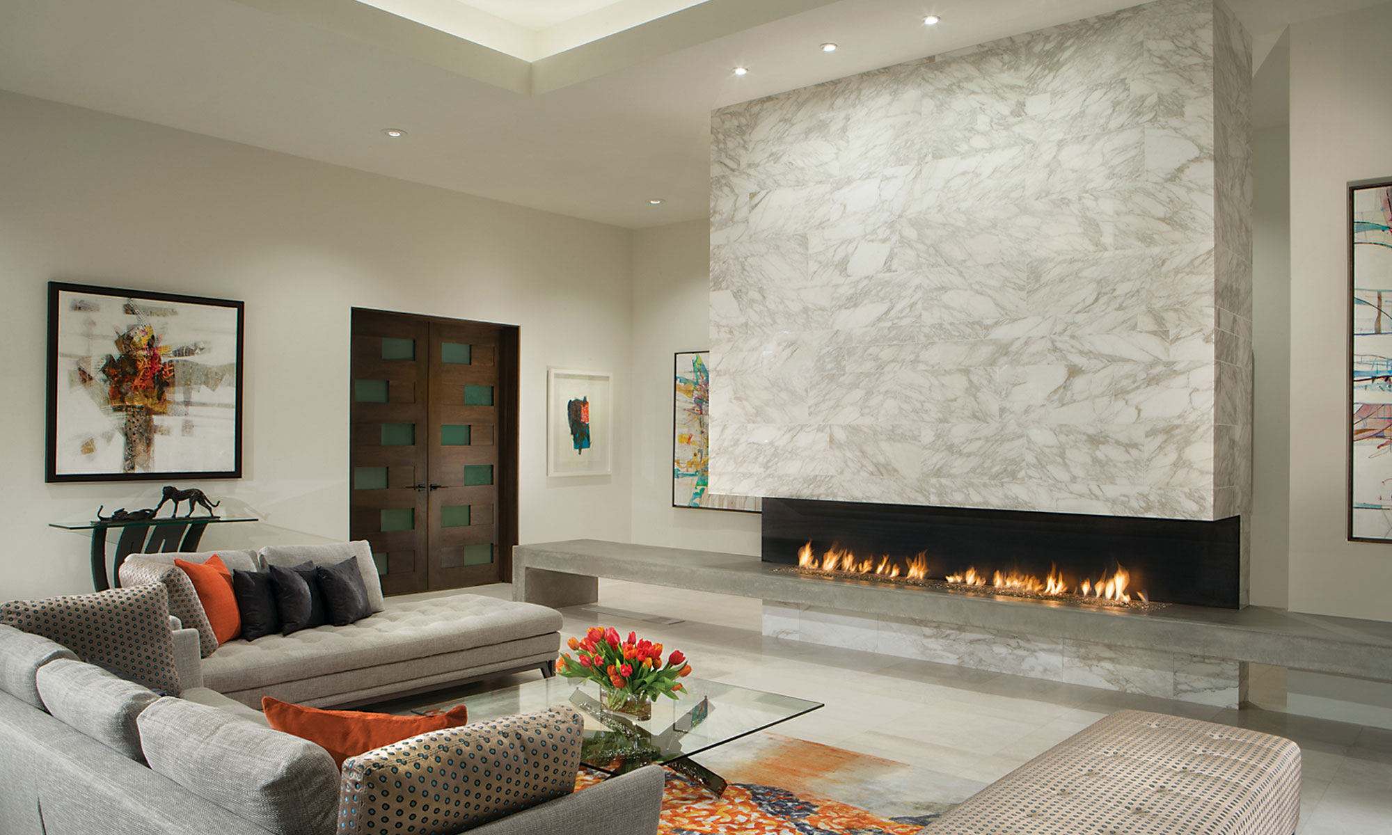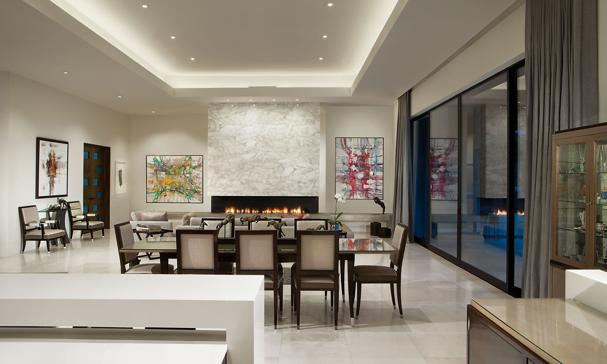 The Janet Brooks Design firm team incorporated a modern update to an outdated North Scottsdale home. This Luxury Residential Interior Design highlights white marble flooring, floating cabinets, and a stunning, massive Calacatta marble fireplace. Good architectural “bones” are a big plus when initiating a remodel effort to change a home’s overall look and function.