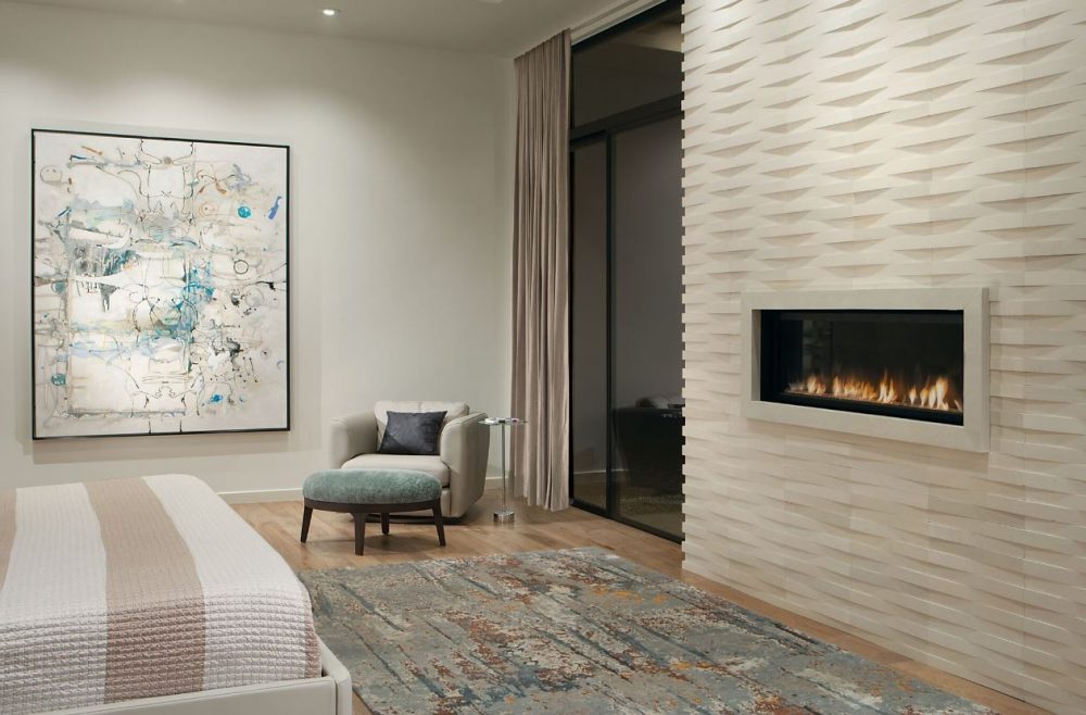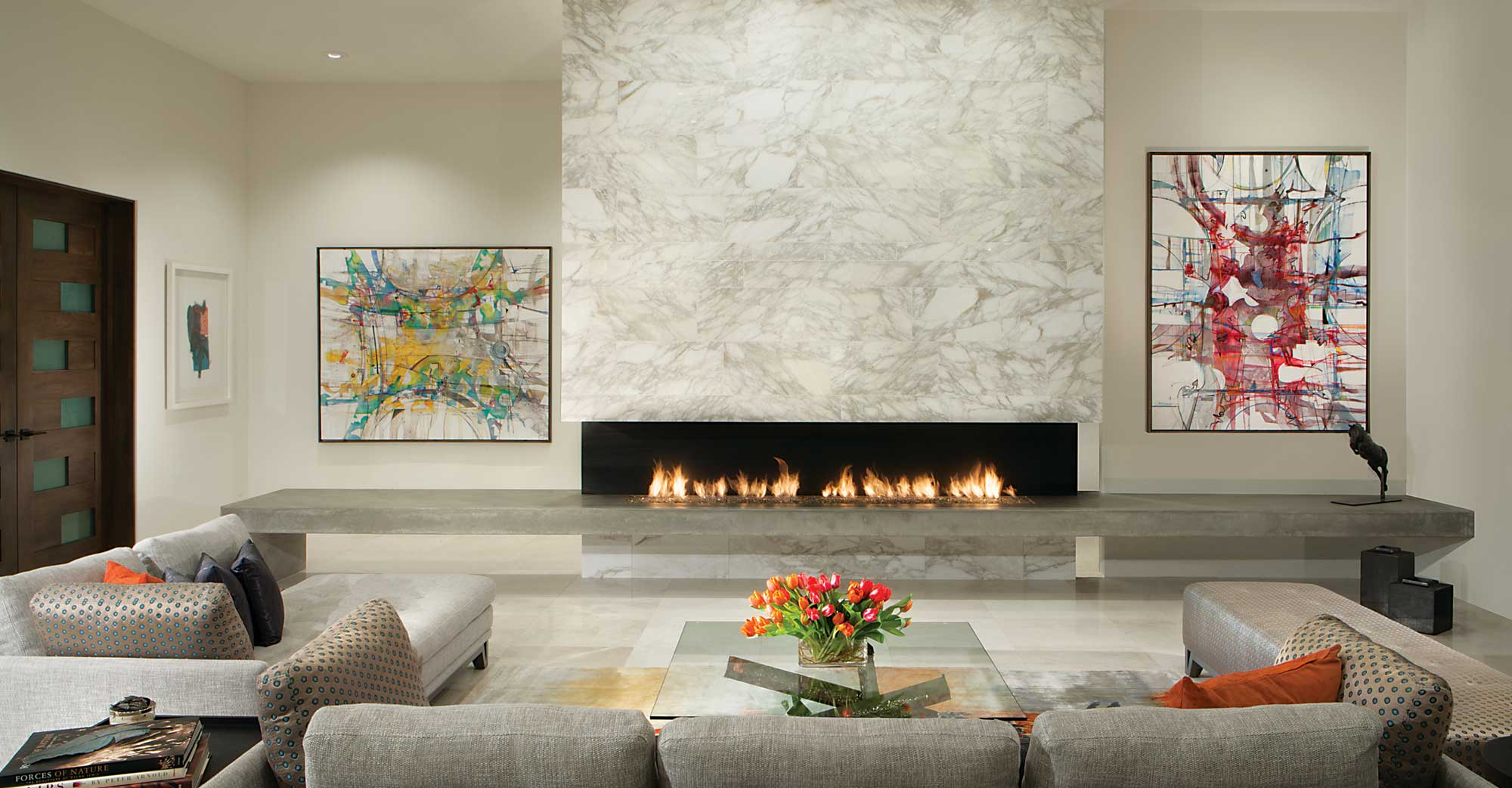We freshened up the look of the home by replacing the tired, traditional looking materials with new white stone flooring, walnut veneer cabinets, a stunning new Calacatta marble fireplace and great looking interior doors with glass insets. Add lighter walls and simpler lines, and you have an inviting, calm contemporary home.