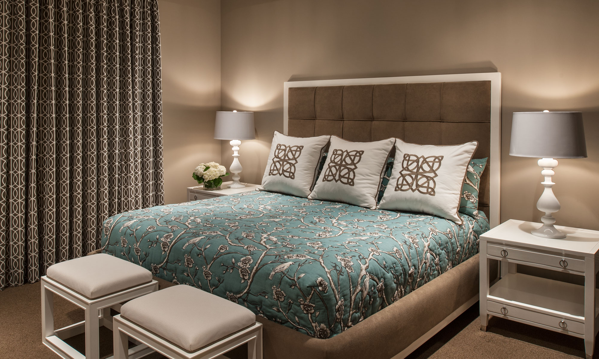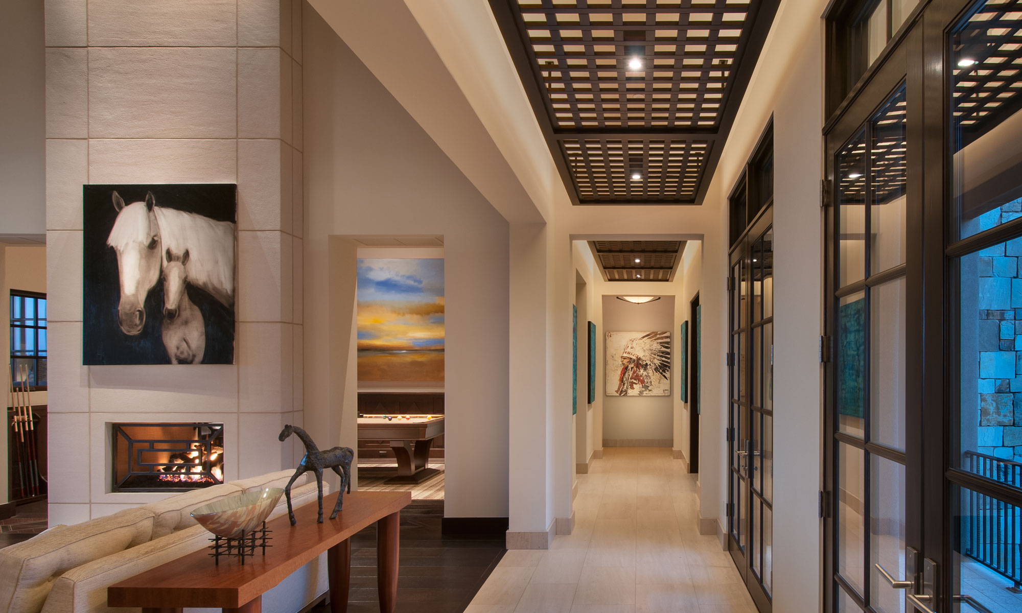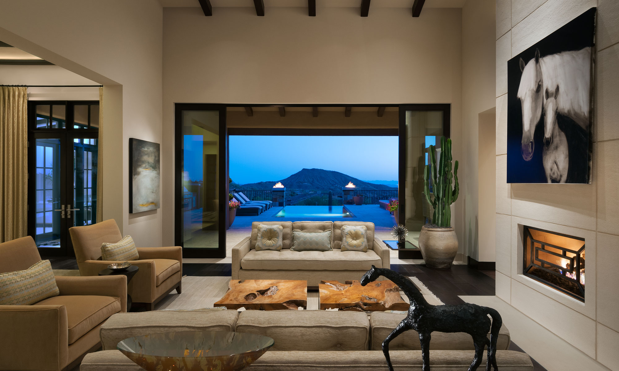 For this exclusive Scottsdale interior design project, our team designed custom furniture for the master bedroom with clean lines and beautiful oak and walnut wood inlays that follow the architectural lines of the home and lead the eye to the beautiful environment just outside the patio doors. Many interesting pieces of art, both sculptural and painted, add richness and personal interest in these stunning spaces.