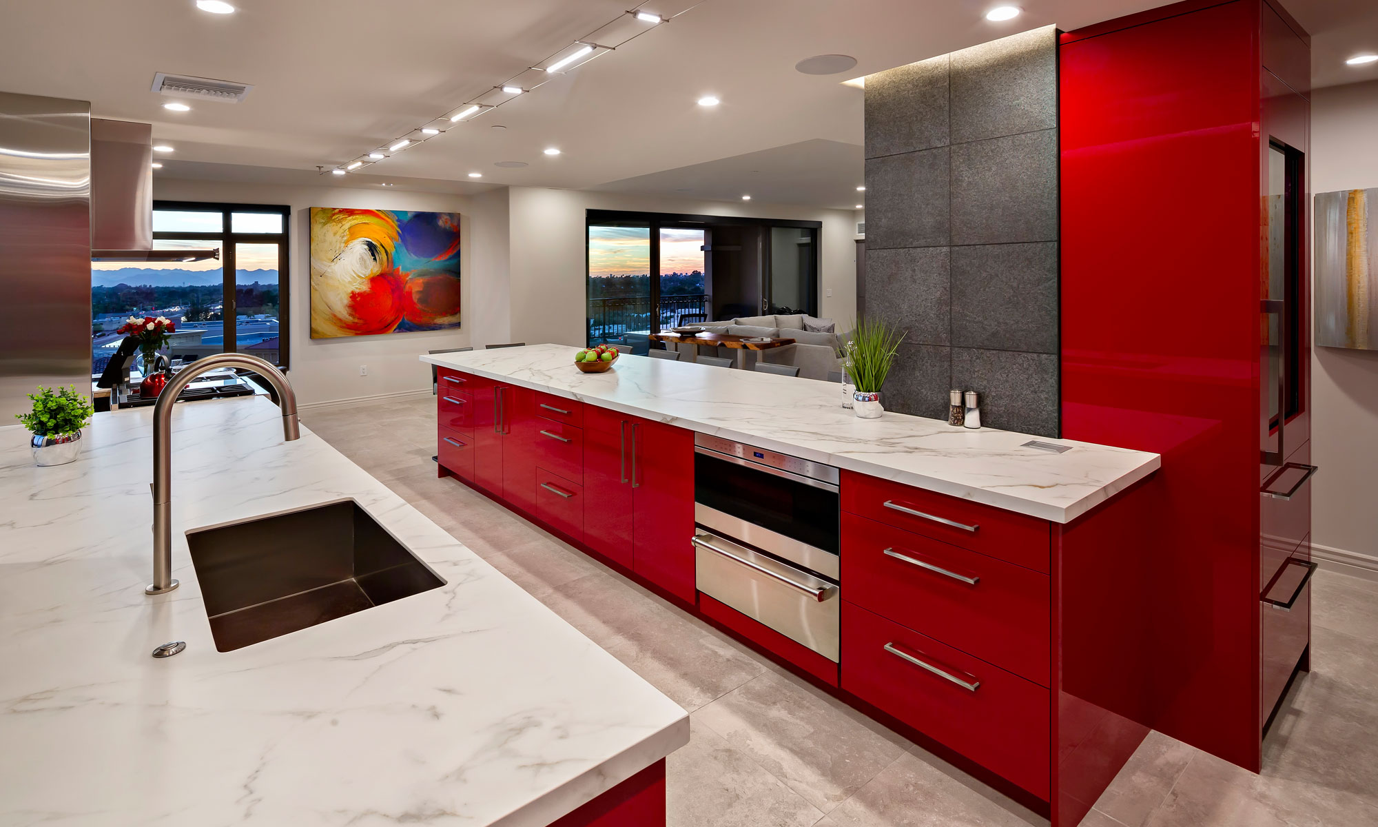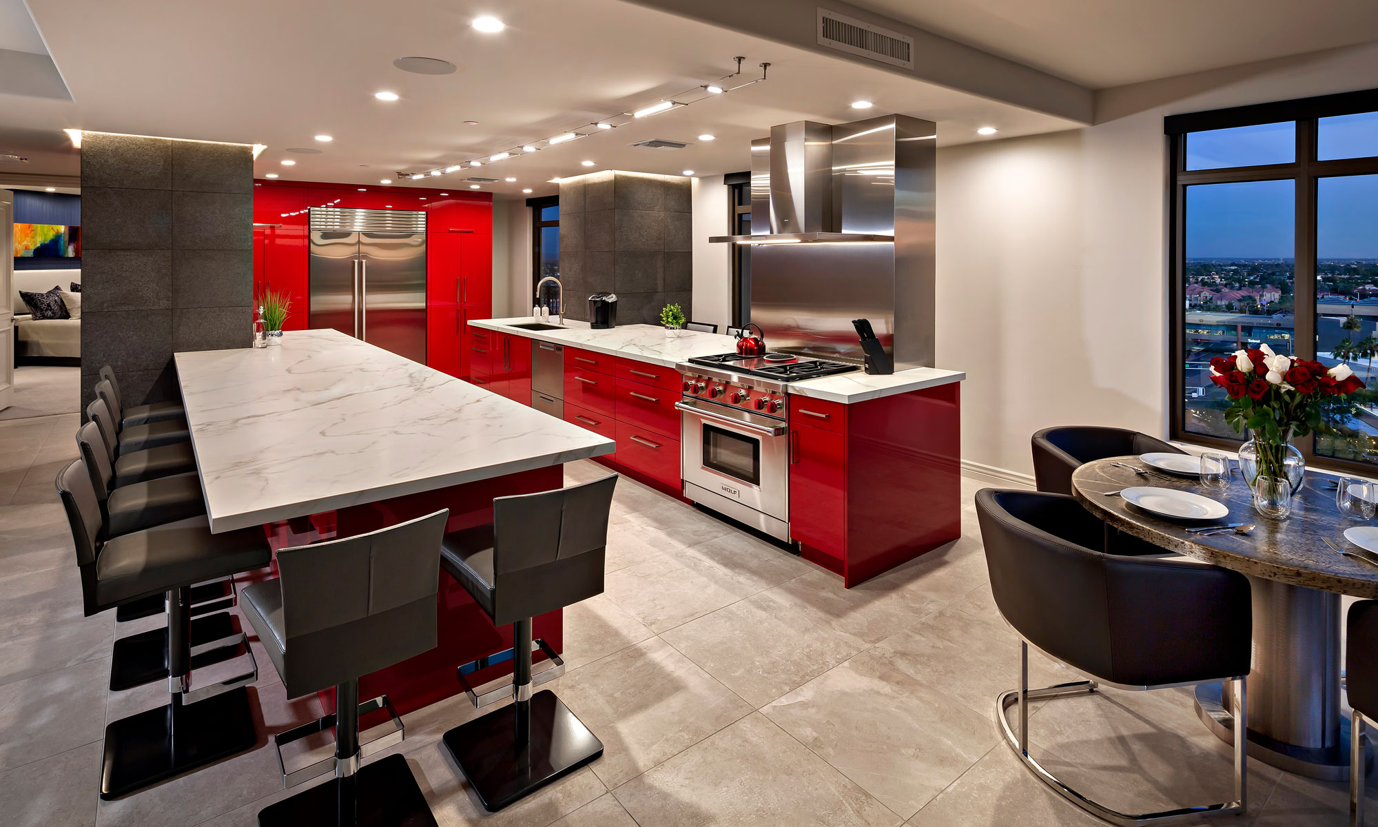 Our clients’ primary residence is a sprawling home on a river in southwestern Colorado, so a condominium in a high-rise in downtown Scottsdale is a huge contrast in lifestyles. But they were excited about the possibilities. They found a place in a great location, a short walk from great restaurants, bars and shopping, but it was an old style floorplan, with separated rooms and obstructed views. Our remodeling solution to these segmented, dark spaces was to take out walls and turn the kitchen, breakfast area, dining room, and living room into one large space with fabulous 180-degree views and a lot of natural light streaming in the windows throughout the day.