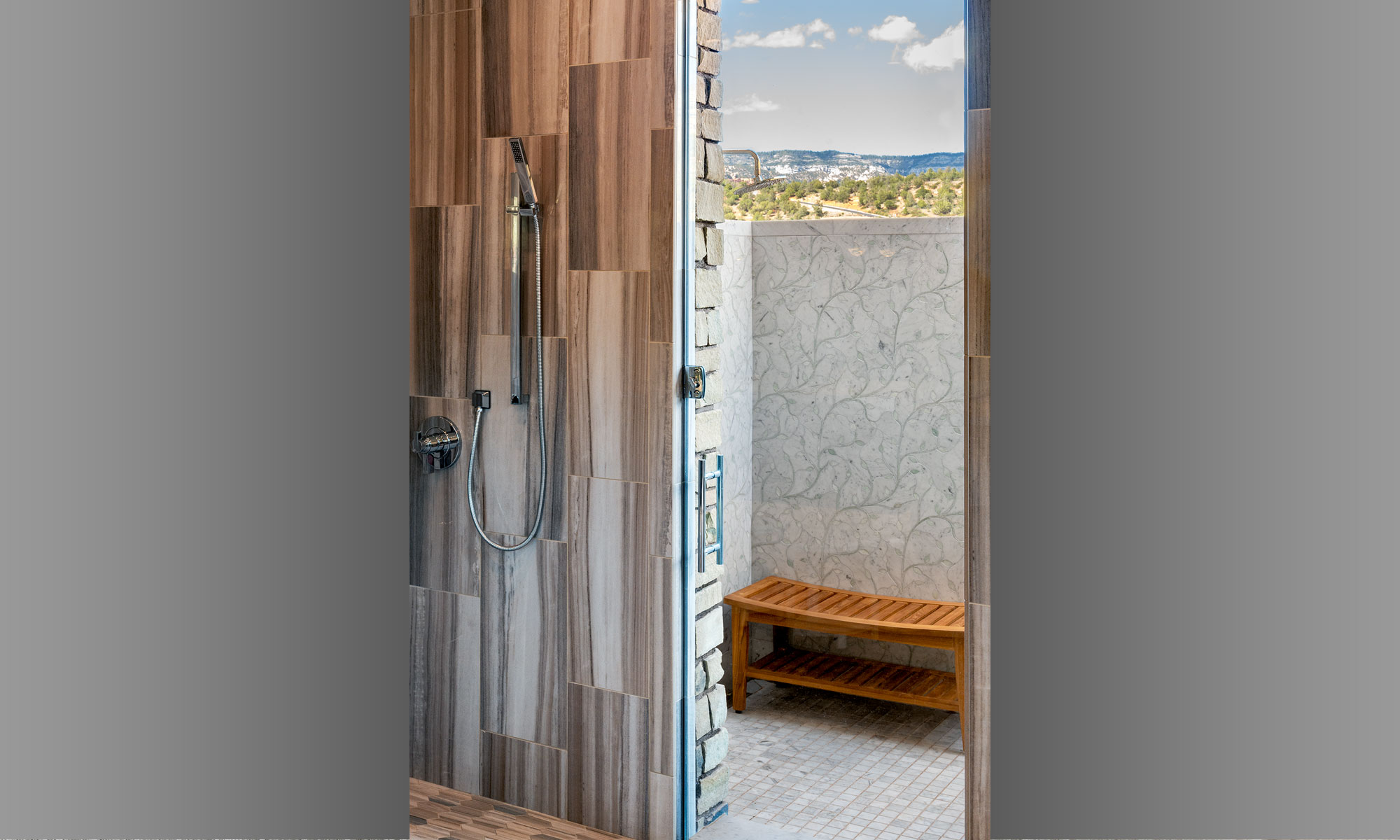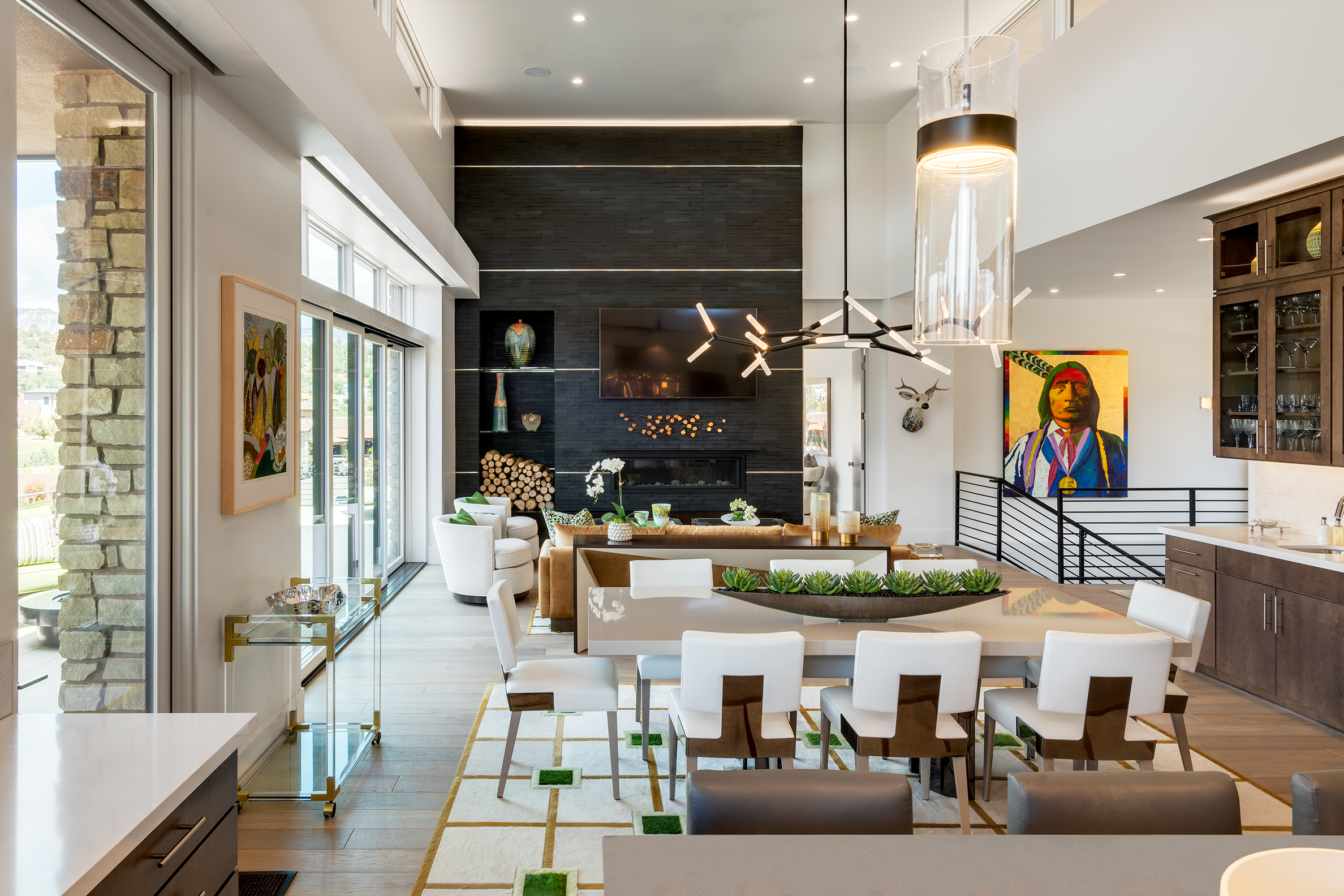 The use of unabashed color in the interior palette of this home gives it a vibrant and exciting energy, blending with and complimenting the bold colors of Mother Nature outside…the greens of the Pinon trees and the golf course grass, the blue of the sky and the terra cotta/gold hues of the rock formations themselves.