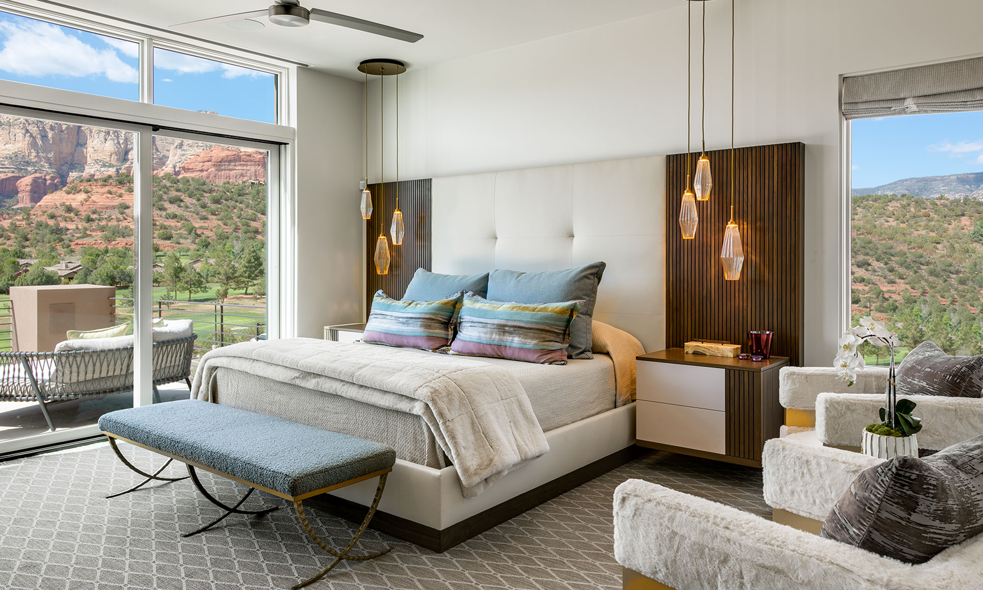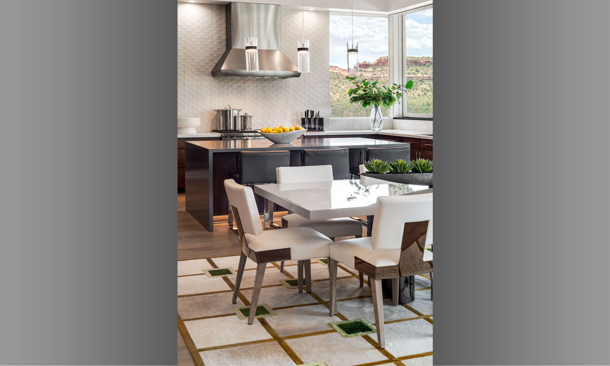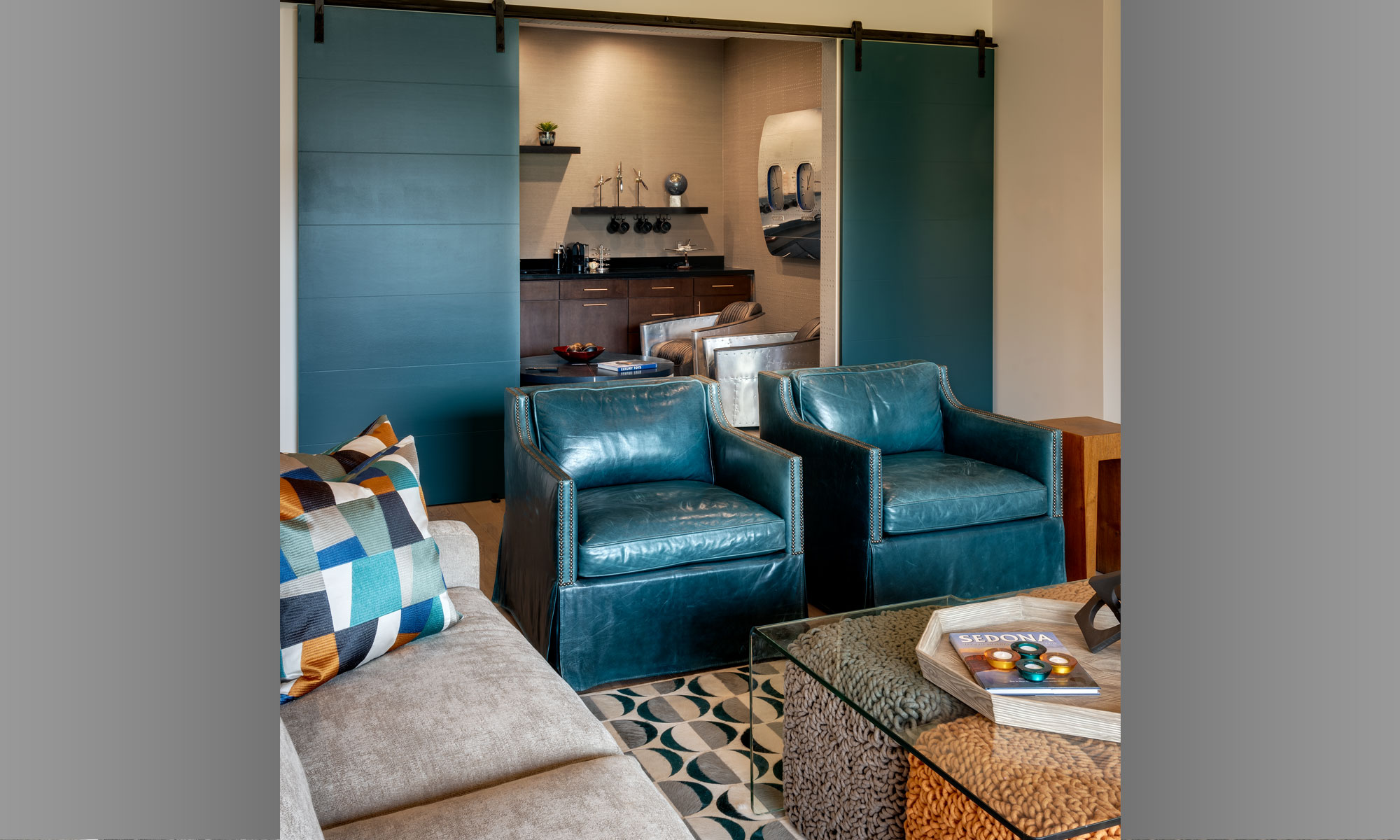 Our clients were inspired by the patterns and depth of color in the custom Kyle Bunting hair on hide area rugs. Designing them was the starting point for our design process, leading to the selection of fabrics and furnishings to complete the picture. Our clients also owned a Native American portrait by Santa Fe artist, Stan Natchez, which greets visitors as they enter the home and sets the stage for this contemporary Southwestern jewel in the Red Rocks of Sedona.