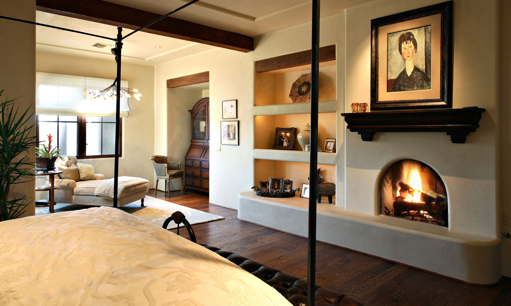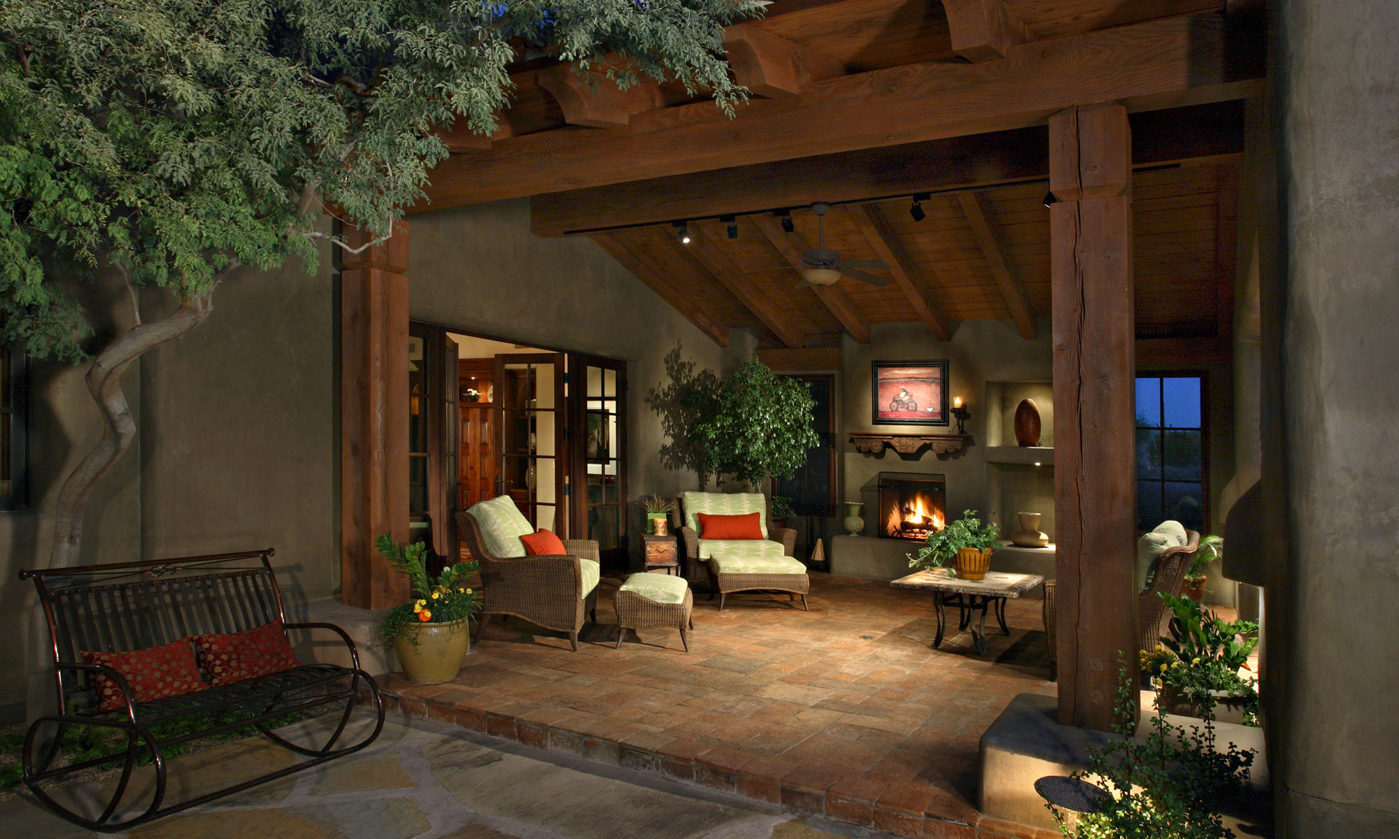 From Native Americans, we get the corner fireplace with arched opening, which was called a Kiva. From other warm-weather locales, we get clay tile roofs. From nearby Santa Fe, New Mexico, we have the opportunity to make use of multi-talented artisans who work in carved wood, usually reclaimed. From Mexico, we have the influence of clay tiles on our floors, called Saltillo tiles. And from the Sonoran Desert weather itself, and lack of attacking insects, we have the ability to enjoy open outdoor spaces during most of the year, such as the one facing the back yard and pool in this home located in Sincuidados, Scottsdale.