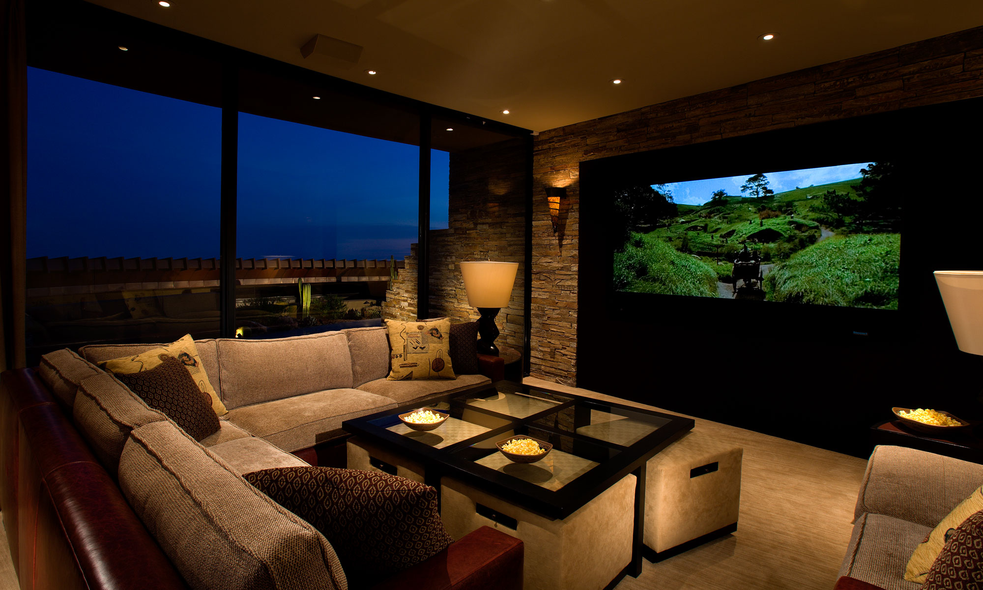 Perched on the side of a mountain in far North Scottsdale, Arizona, this Southwestern interior design home features many exterior curved walls covered in gorgeous quartzite ledgestone, which embrace the inside-out Arizona lifestyle when they continue to the interior of the home to become part of the overall architectural design theme.